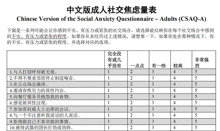 Chinese Version of the Social Anxiety Questionnaire – Adults (CSAQ-A)